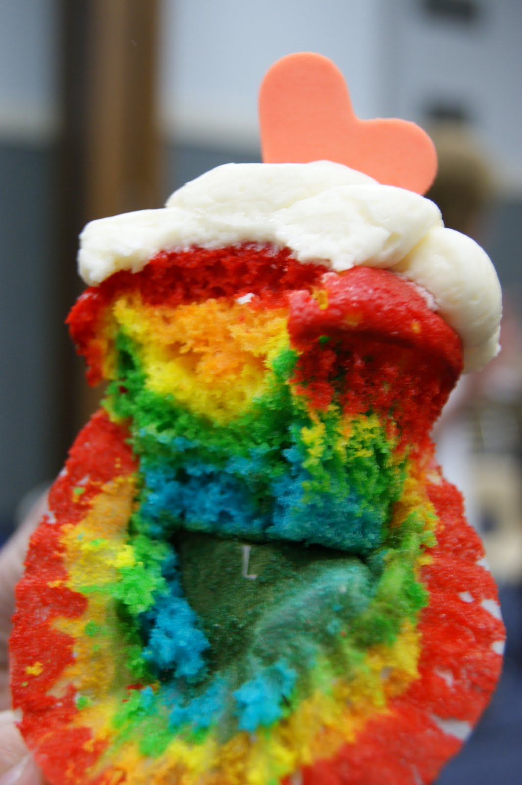 I made these last year for St. Patrick's Day. My boys talked all year about the rainbow cupcakes. St. Patty's is here again...and here are the rainbow cuppy cakes. Think it will be a tradition like the green leprechaun pee they found in the toilet last year and eating Lucky Charms for breakfast! These do take a little bit of effort, patience, and love. Give yourself time to smooth the colored layers out or you will end up with a tie dye effect instead of a striped effect. (Which works). You can do these any colors you want. Or choose two colors and stripe them...whatever works. Me? I used red, orange, yellow, green and blue. Practice filling up one cup first and figure out what works. 1 tsp. , 2 tsp...of each color...etc. Then move on to factory style to finish faster. Fill up all the blue, then green, etc. You can use a cake mix or homemade batter. I doctored up a cake mix. I also rolled out store-bought Wilton ready to roll fondant (bought mine at Walmart for $8 in the cake craft area. I have enough to do quite a few more projects...) and cut out little hearts with a cookie cutter. I did this a few days in advance so they had plenty of time to harden up. Took a little pre-planning and ten extra minutes....but made a big impact on the top of the cupcakes. See the cake recipe and instructions below from Christy who got it first here.